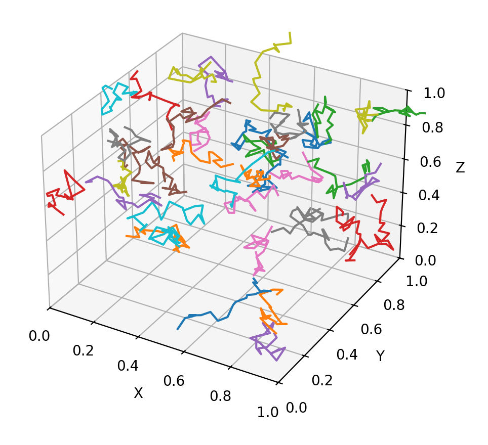 # Data: 40 random walks as (num_steps, 3) arrays